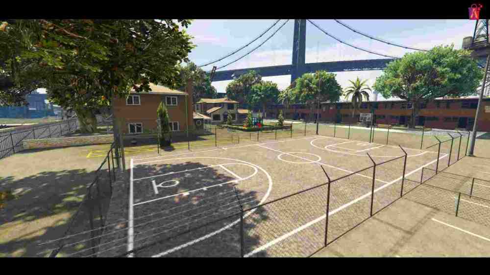 • Basketball court: Central court surrounded by lush trees.